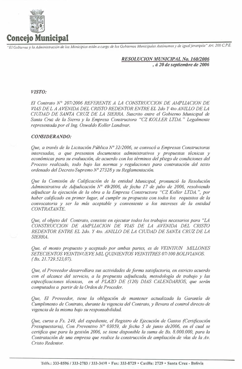 Aprueba el Contrato No. 207/2006 referente a la Construcción de ampliación de vías de la Avenida Cristo Redentor entre el 2do. y 4to. Anillo, Empresa CZ KOLLER LTDA.