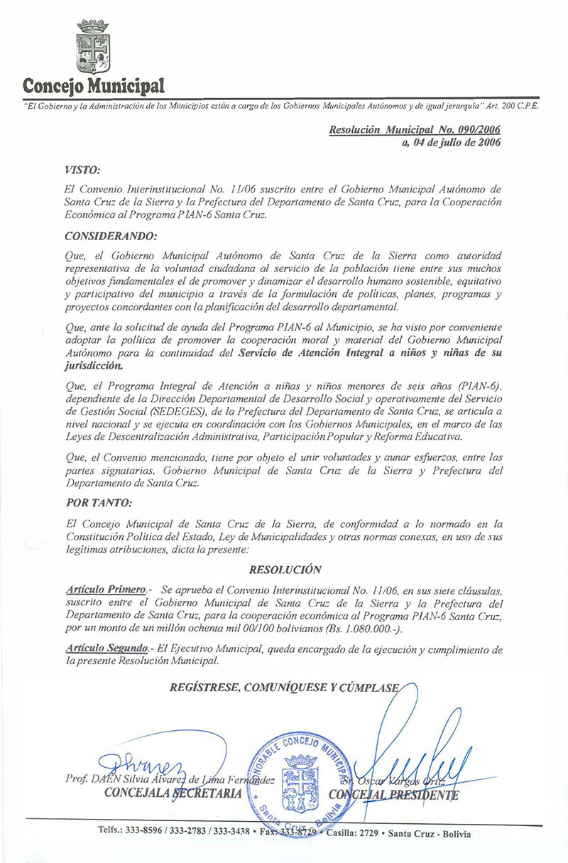 Aprueba el Convenio Interinstitucional No. 011/2006, suscrito con la Prefectura del Departamento, para la cooperación económica al Programa PIAN-6.