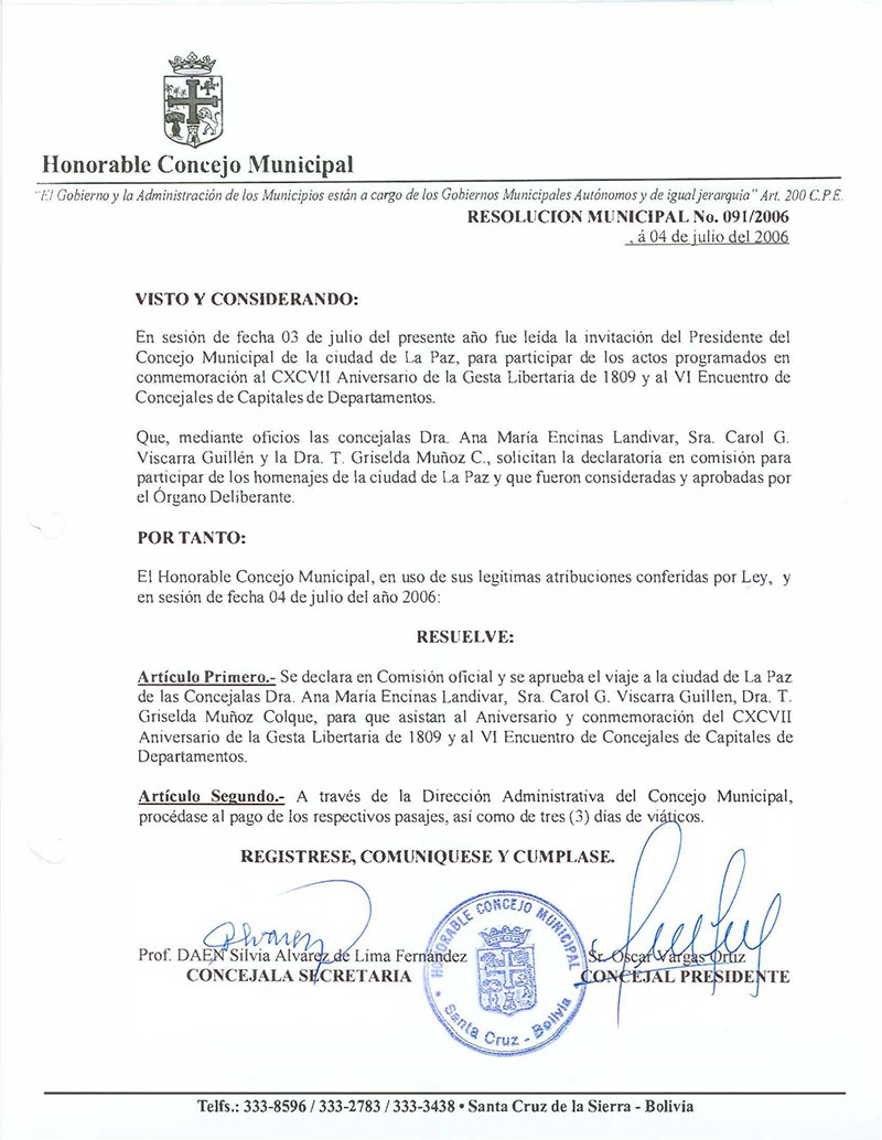 Aprueba el viaje a la ciudad de La Paz de las Concejalas Dra. Ana María Encinas, Carol Viscarra, Griselda Muñoz, para participar del aniversario de esa ciudad capital.