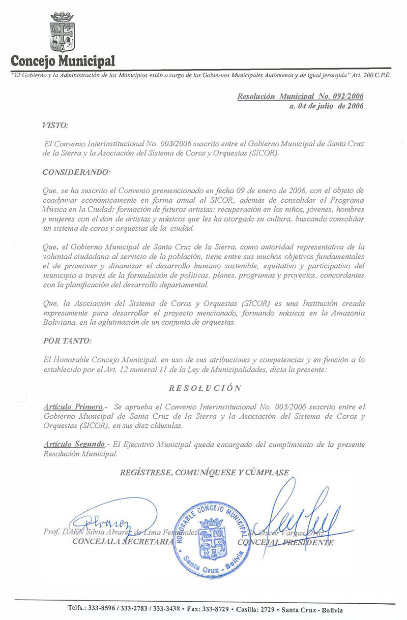 Aprueba el Convenio Interinstitucional No. 003/2006, suscrito con la Asociación del Sistema de Coros y Orquestas (SICOR).