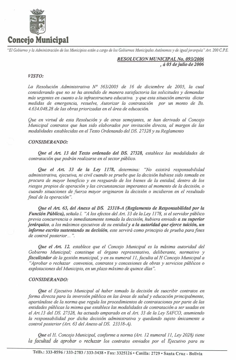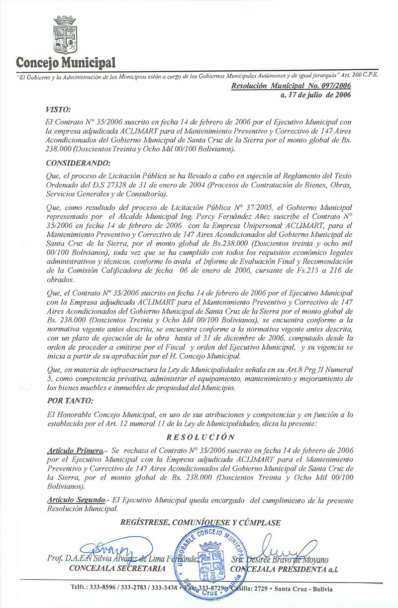 Rechaza el Contrato No. 035/2006, suscrito con la Empresa ACLIMART, relativo al mantenimiento preventivo de los aires acondicionados del Gobierno Municipal.