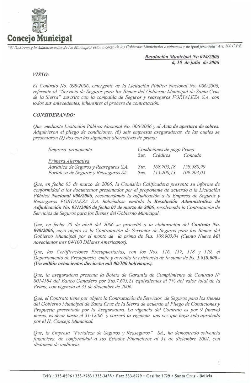 Aprueba el Contrato No. 098/2006, suscrito con la Empresa FORTALEZA S.A., para el servicio de Seguros para los Bienes del Gobierno Municipal.