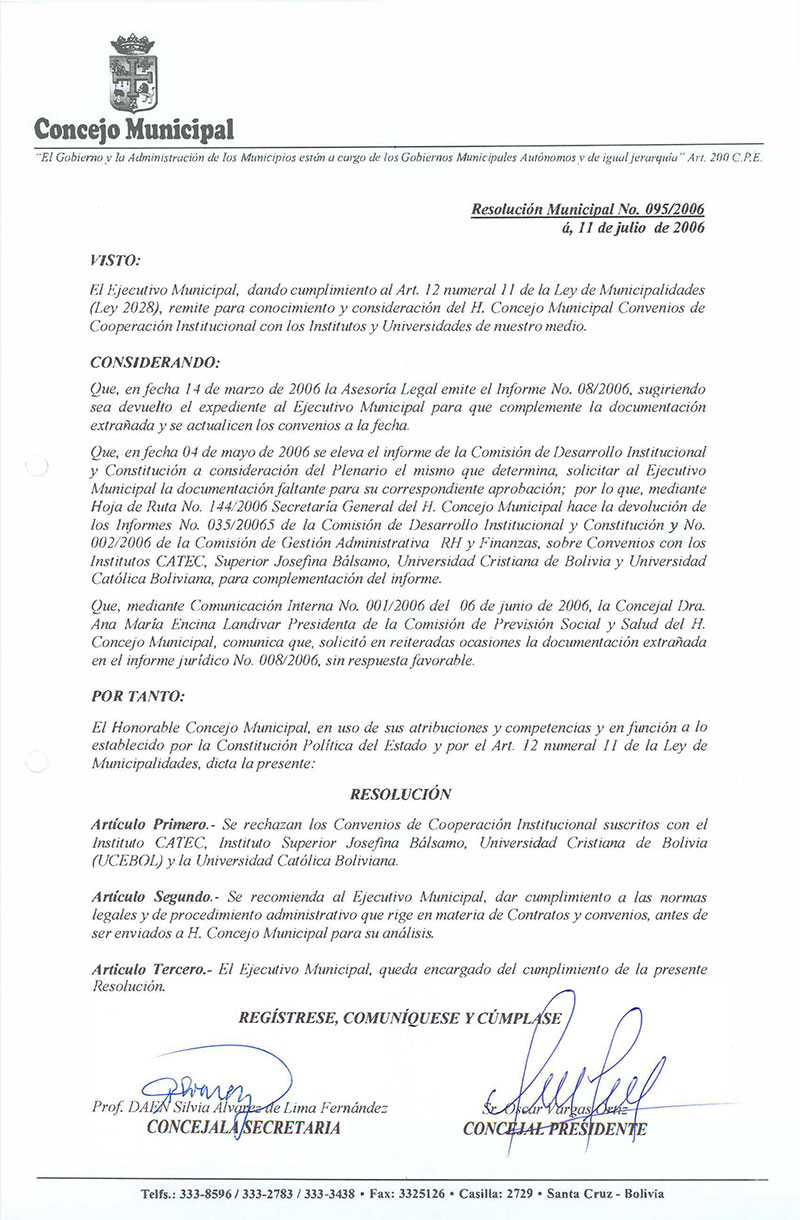 Rechazan los Convenios de Cooperación Institucional suscritos con el Instituto CATEC, Instituto Superior Josefina Bálsamo, Universidad Cristiana de Bolivia – UCEBOL y la Universidad Católica Boliviana.