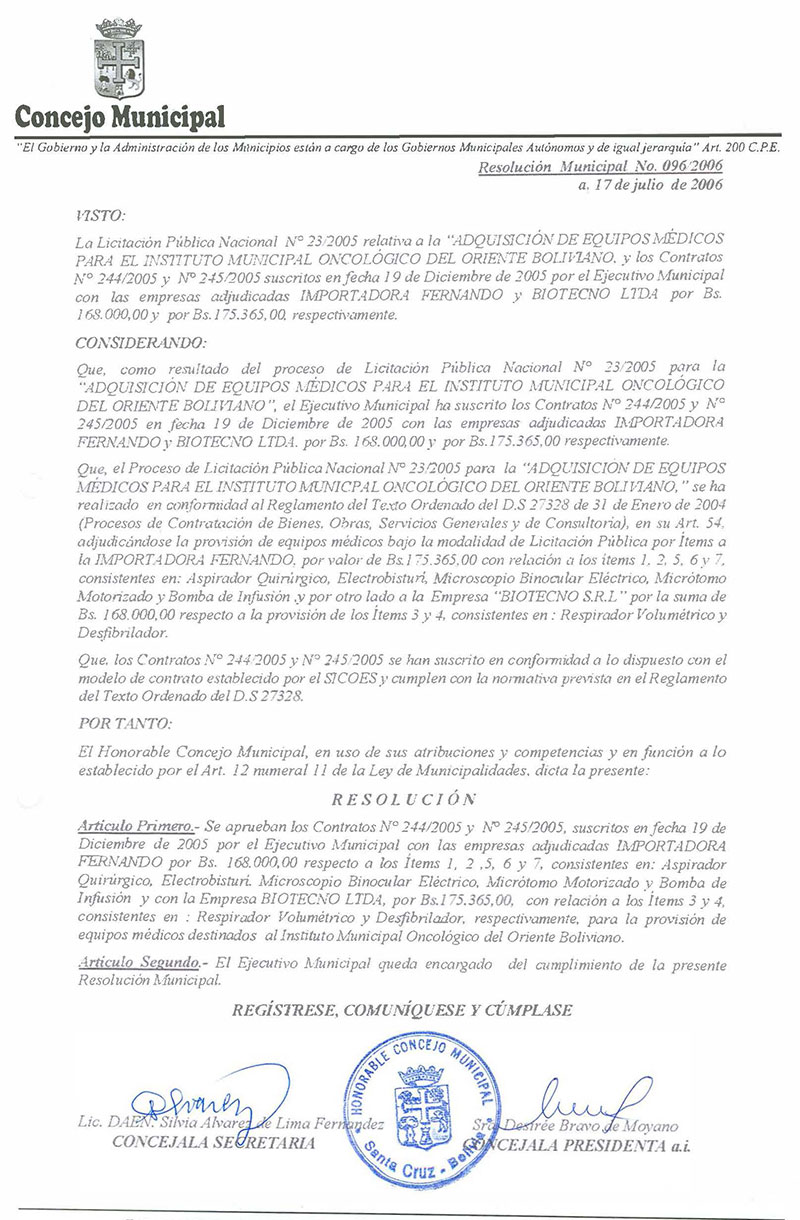 Aprueban los Contratos Nos. 244/2005 y 245/2005, suscritos con las Empresas IMPORTADORA FERNANDO y Empresa BIOTECNO LTDA., para la provisión de equipos médicos para el Instituto Oncológico.
