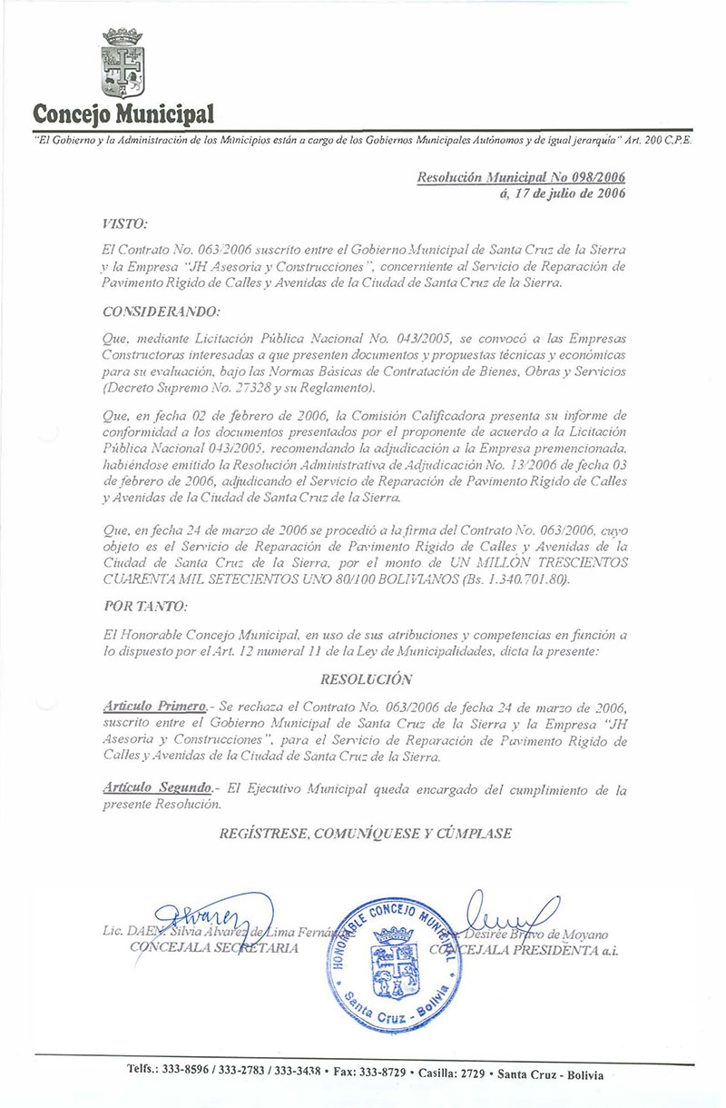 Rechaza el Contrato No. 063/2006, suscrito con la Empresa JH Asesoría y Construcciones, relativo a la reparación de pavimento rígido de calles y avenidas.