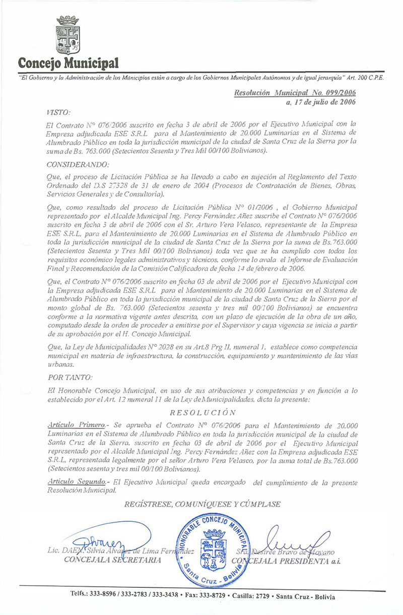 Aprueba el Contrato No.076/2006, suscrito con la Empresa ESE SRL., relativo al mantenimiento de luminarias de alumbrado público.