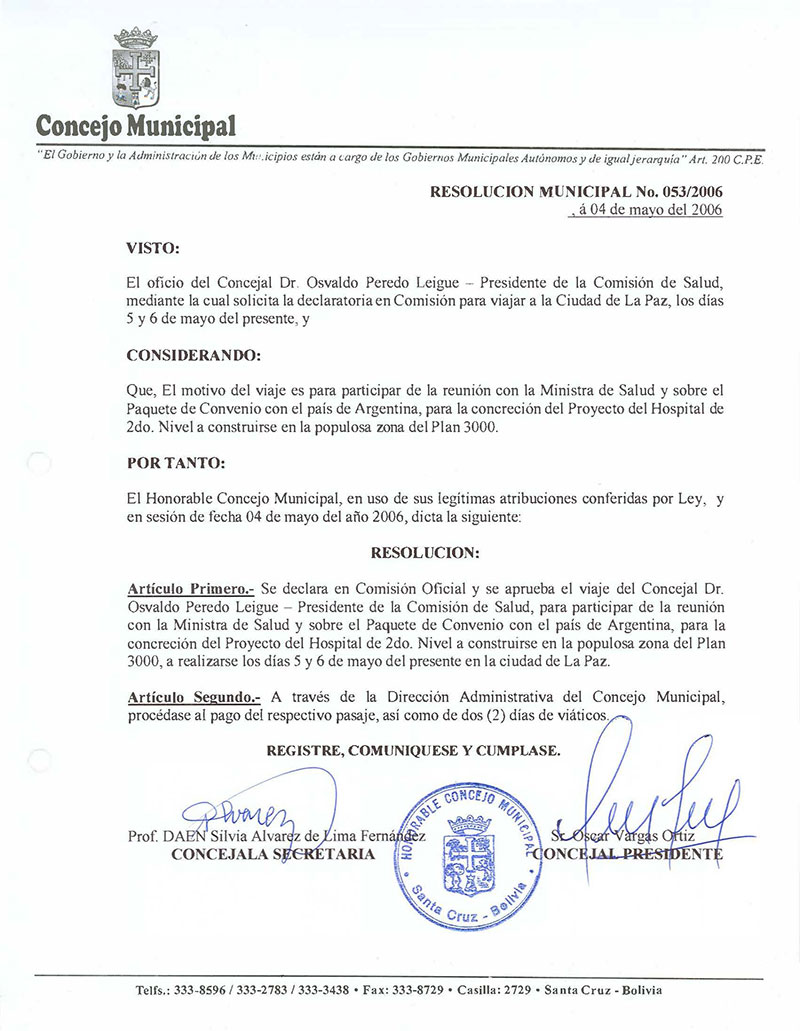 Aprueba el viaje del Concejal Oswaldo Peredo a la ciudad de La Paz, para que participe de la reunión con la Ministra de Salud.