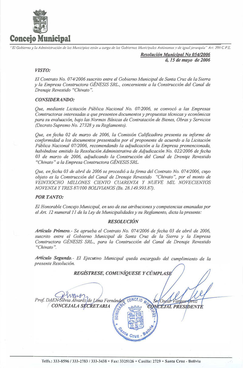 Aprueba el Contrato No. 074/2006, suscrito con la Empresa Constructora GÉNESIS SRL., para la construcción del canal de drenaje revestido Chivato.