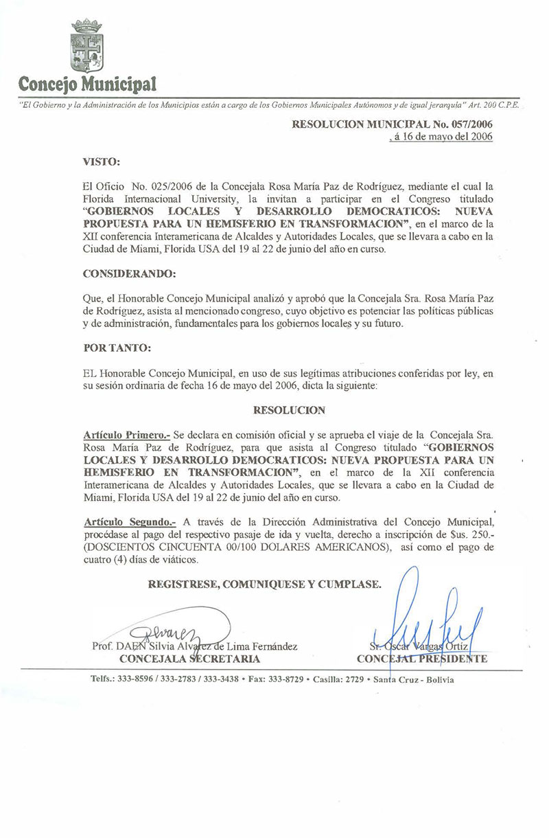 Se declara en comisión oficial y se aprueba el viaje de la Concejala Sra. Rosa María Paz de Rodríguez, para que asista al Congreso titulado "GOBIERNOS LOCALES Y DESARROLLO DEMOCRATICOS: NUEVA PROPUESTA PARA UN HEMISFERIO EN TRANSFORMACIÓN", en el marco de la XII conferencia Interamericana de Alcaldes y Autoridades Locales, que se llevara a cabo en la Ciudad de Miami, Florida USA del 19 al 22 de junio del año en curso.