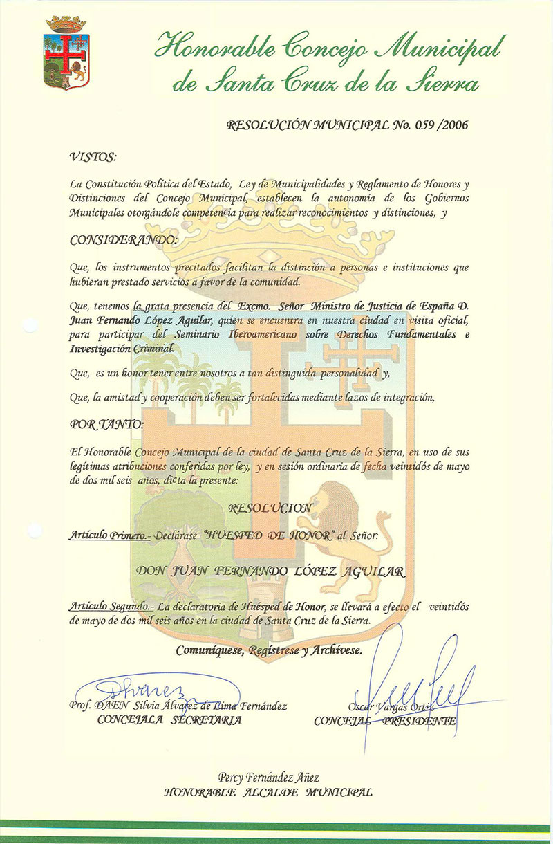 Declara Huésped de Honor al Sr. Juan Fernando López Aguilar – Ministro de Justicia de España.