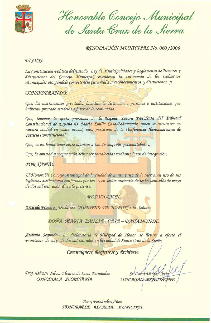 Declara Huésped de Honor a la Sra. María Emilia Casa – Bahamonde, – Presidenta del Tribunal Constitucional de España.