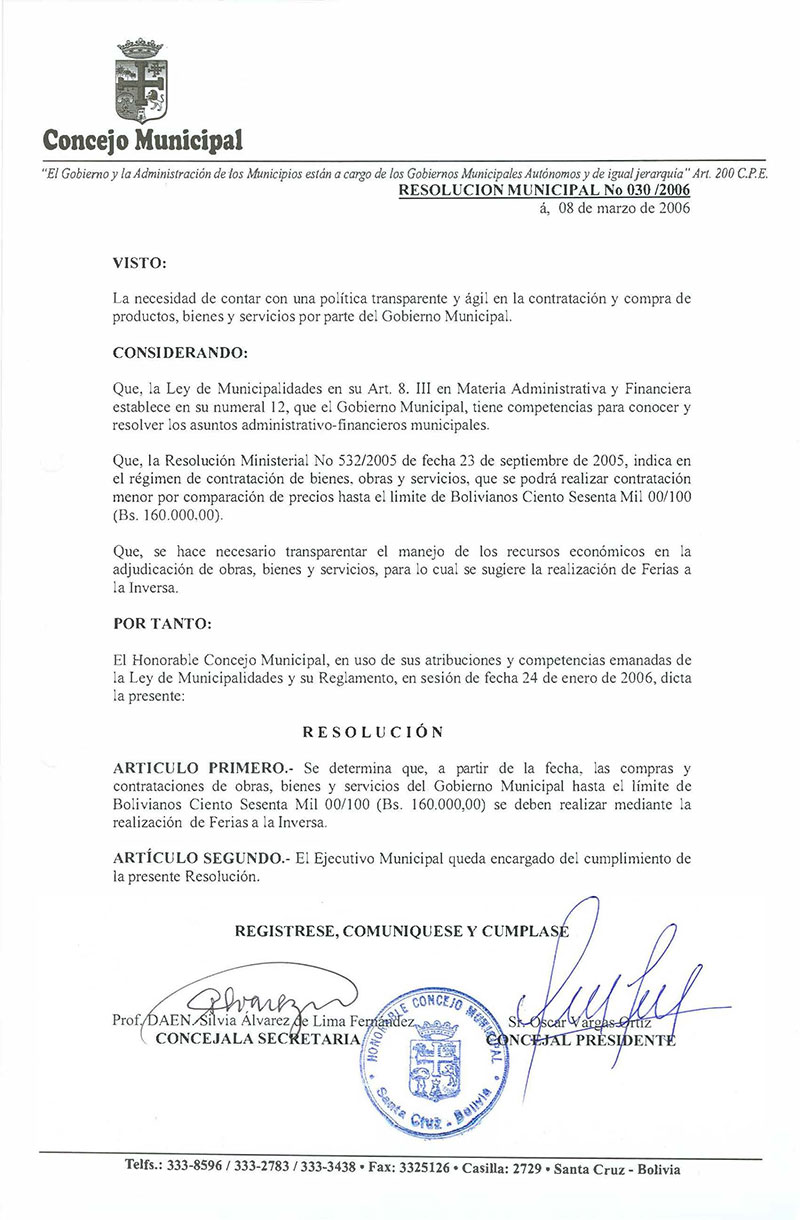 Determina que a partir de la fecha, las compras y contrataciones de obras y bienes y servicios del Gobierno Municipal, hasta el límite de Bs. 160.000, se deben realizar mediante la Ferias a la Inversa.