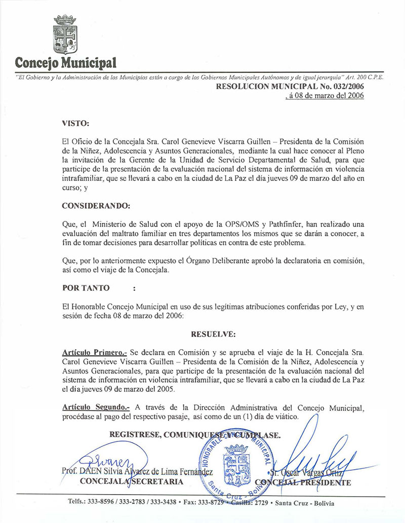 Aprueba el viaje de la Concejal Carol Viscarra a la ciudad de La Paz, para participar en la presentación del sistema de información en violencia intrafamiliar.