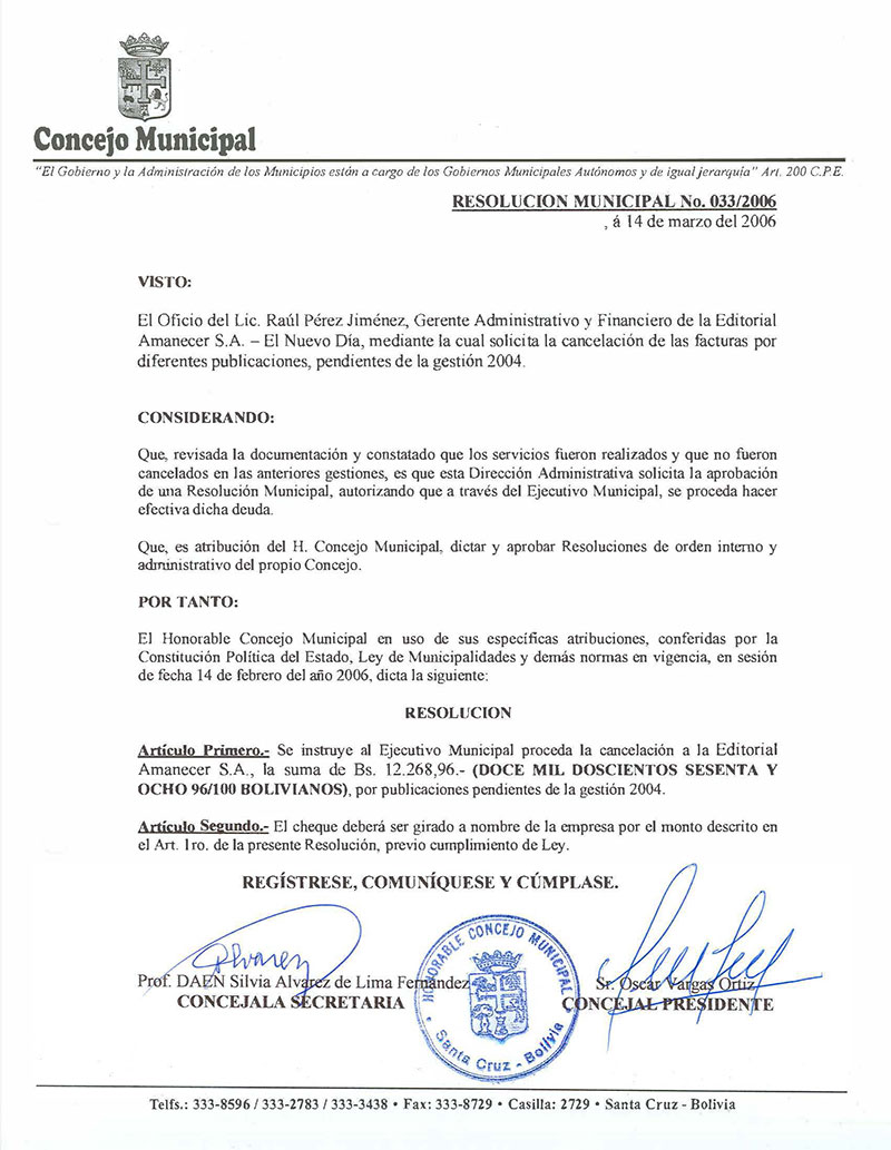 Instruye al Ejecutivo Municipal la cancelación a la Editorial Amanecer S.A. (Nuevo Día) la suma de Bs. 12.268,96.
