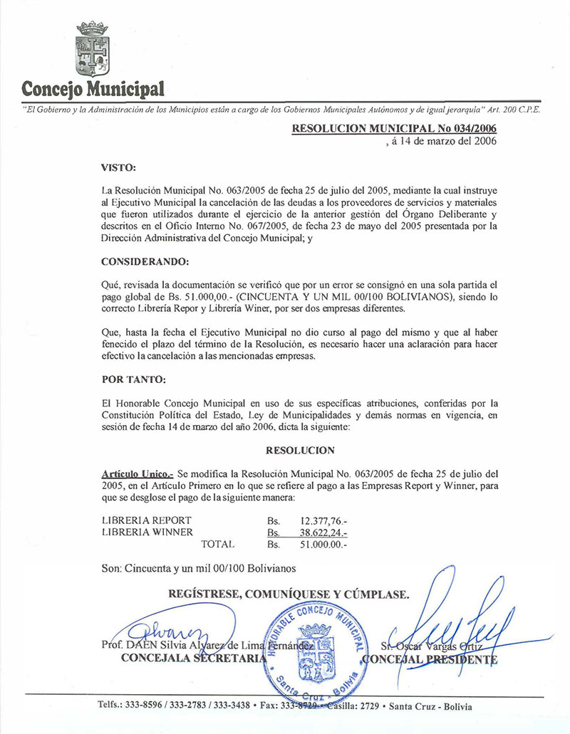 Modifica la Resolución Municipal No. 063/2005, sobre el pago a las Empresas Winer y Report.