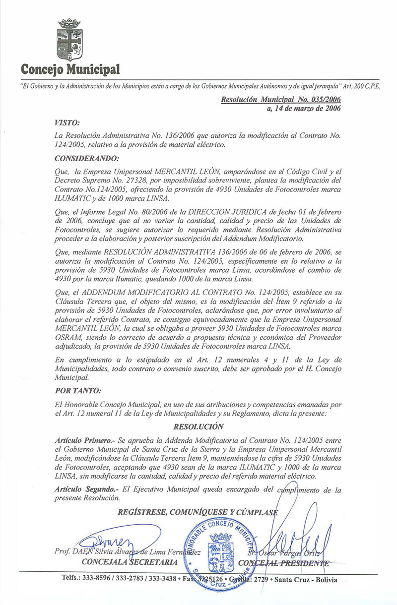 Aprueba la Addenda modificatoria al Contrato No. 124/2005, suscrito con la Empresa Unipersonal Mercantil León, con relación a las unidades de fotocontroles.