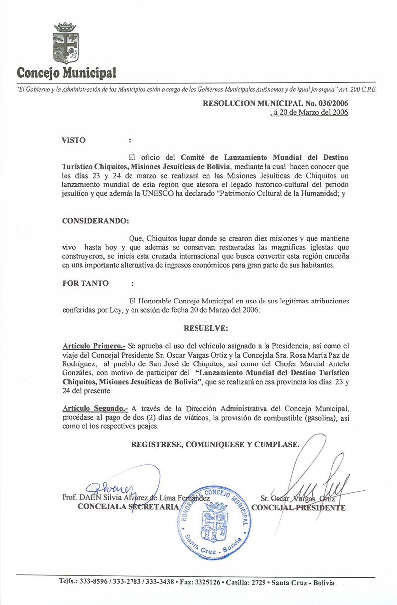 Aprueba el uso del vehículo y el viaje del Presidente Sr. Oscar Vargas y la Concejala Rosa María Paz, al pueblo de San José de Chiquitos.