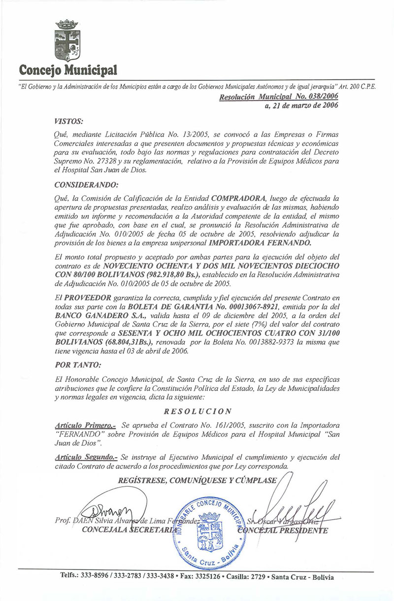 Aprueba el Contrato No. 161/2005, suscrito con la Importadora Fernando, provisión de equipos médicos para el Hospital San Juan de Dios.