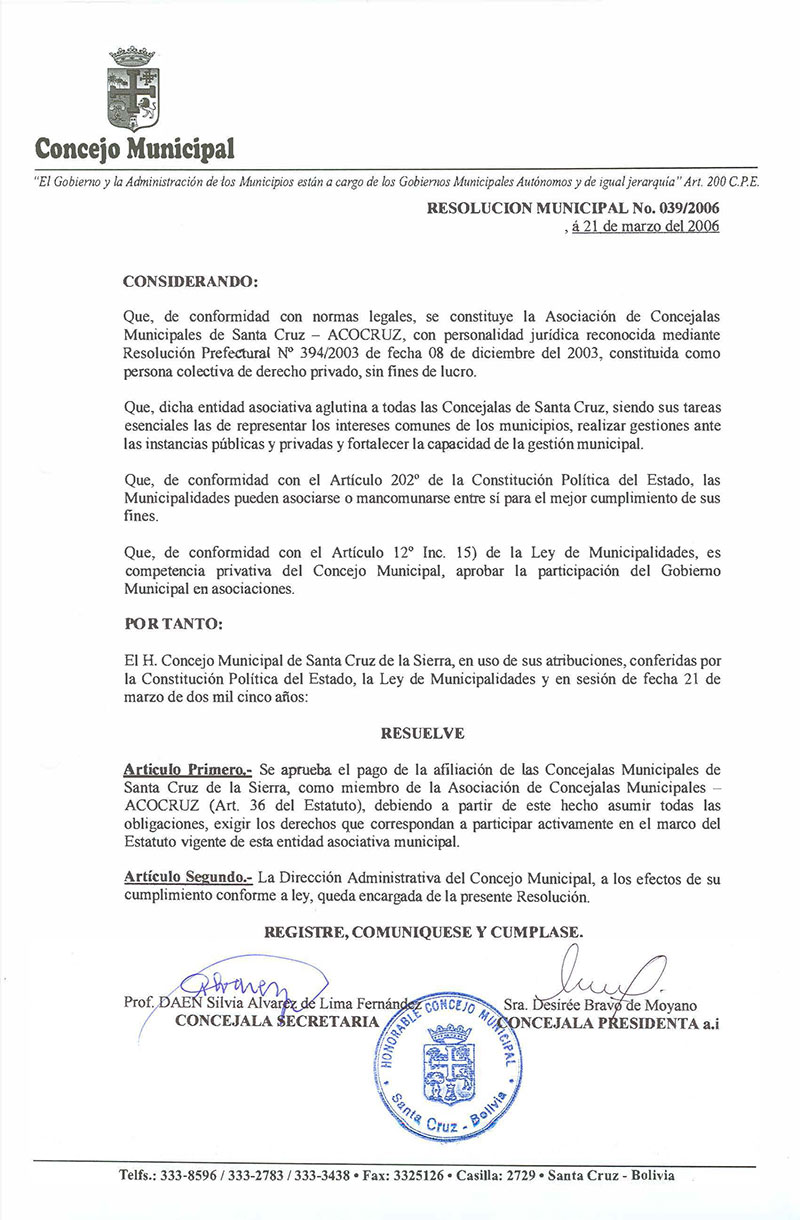 Aprueba el pago de la afiliación de las Concejalas a la Asociación de Concejalas – ACOCRUZ.