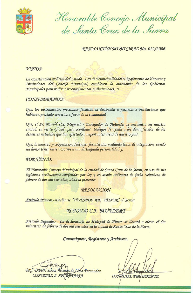 Declara Huésped de Honor al Sr. Ronald C.J. Muyzert, Embajador de Holanda.