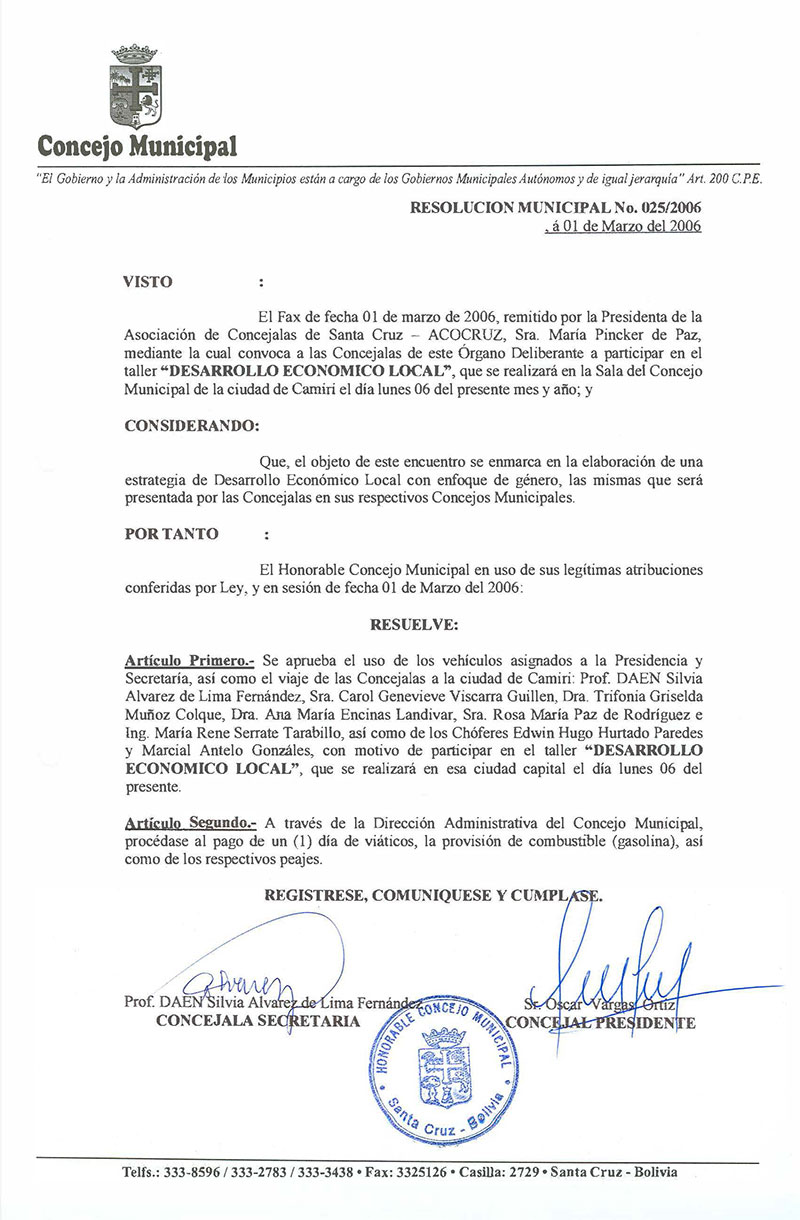 Aprueba el uso del vehículo así como el viaje de las Concejalas Silvia Alvarez, Carol Viscarra, Griselda Muñoz, Ana María Encinas, Rosa María Paz y María René Serrate y del chofer a la ciudad de Camiri, para participar del talle Desarrollo Económico Local.