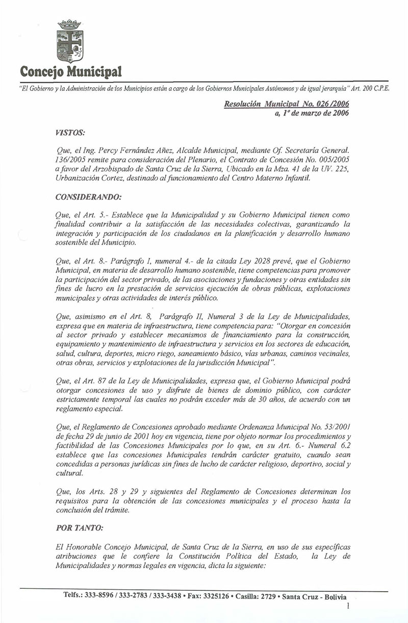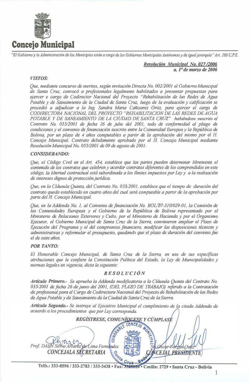 Aprueba la Addenda modificatoria a la Cláusula Quinta del Contrato No. 035/2001, referido a la contratación de profesional para el cargo de Codirectora del Proyecto de rehabilitación de las redes de agua potable y de saneamiento de la ciudad de Santa Cruz.