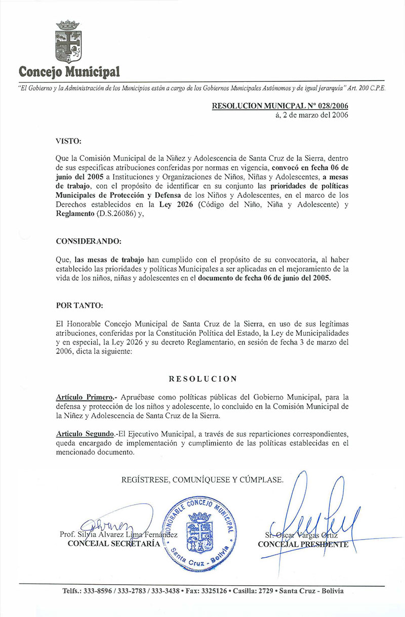 Aprueba como políticas del Gobierno Municipal, para la defensa y protección de los niños y adolescentes el documento de fecha 06 de junio del 2005.