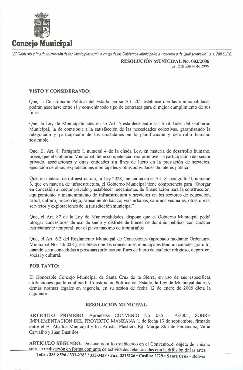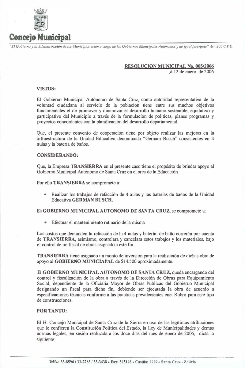 Aprueba el Convenio Interinstitucional No. 030/2006, suscrito con la Empresa TRANSIERRA, para realizar mejoras en la Unidad Educativa Germán Busch.