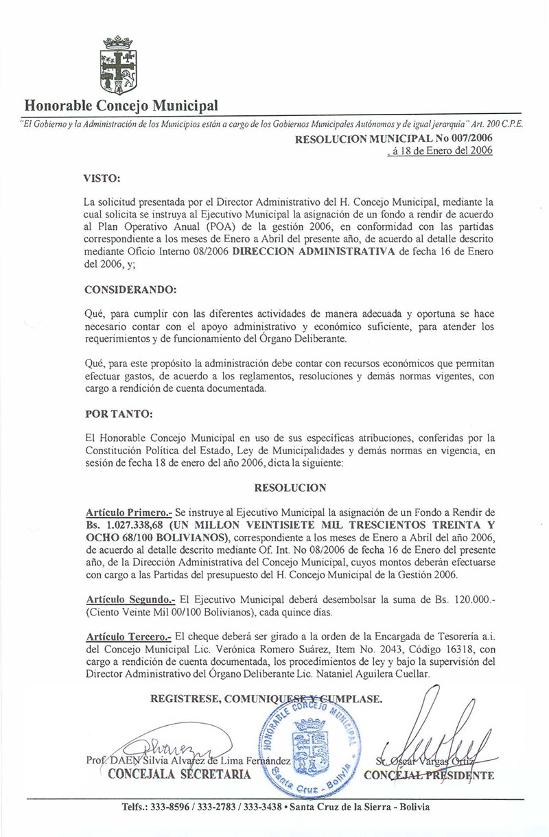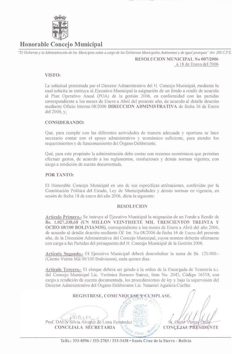 Se instruye al Ejecutivo Municipal la asignación de un Fondo a Rendir deBs. 1.027.338,68 ,un millón veintisiete mil trescientos treinta y ocho 68/100 Bolivianos, correspondiente a los meses de Enero a Abril del año 2006.