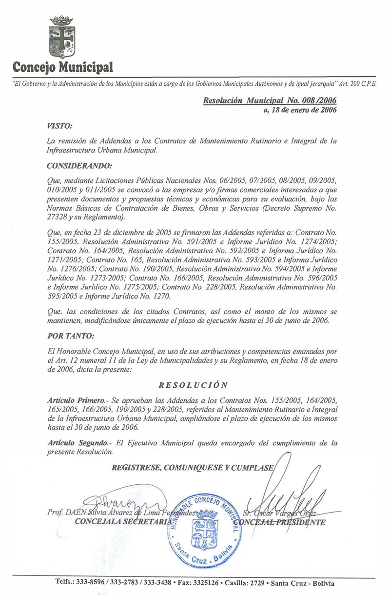 Aprueba el Contrato N° 145/2005, suscrito entre el Gobierno Municipal de Santa Cruz de la Sierra y la Empresa Electromecánica SRL., mantenimiento de de luminarias de alumbrado público.