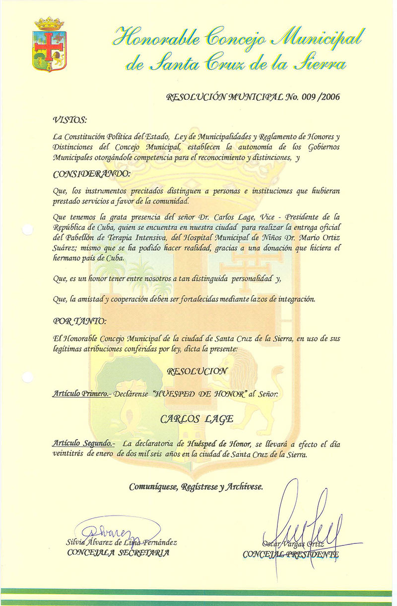 Declara Huésped de Honor al Sr. Carlos Lage, Vicepresidente de Cuba.