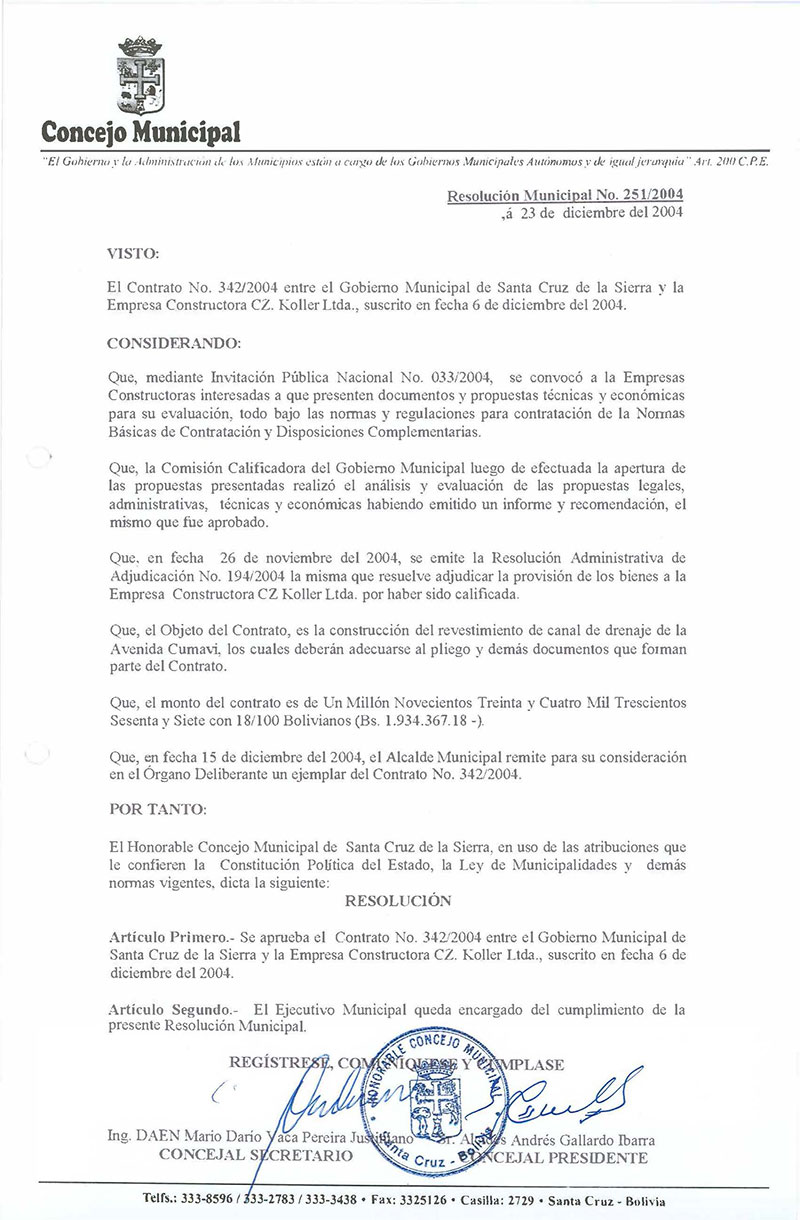 Aprueba el Contrato N° 342/2004, para la construcción del revestimiento de canal de drenaje de la Avenida Cumavi, suscrito con la Empresa Constructora CZ. Koller Ltda.
