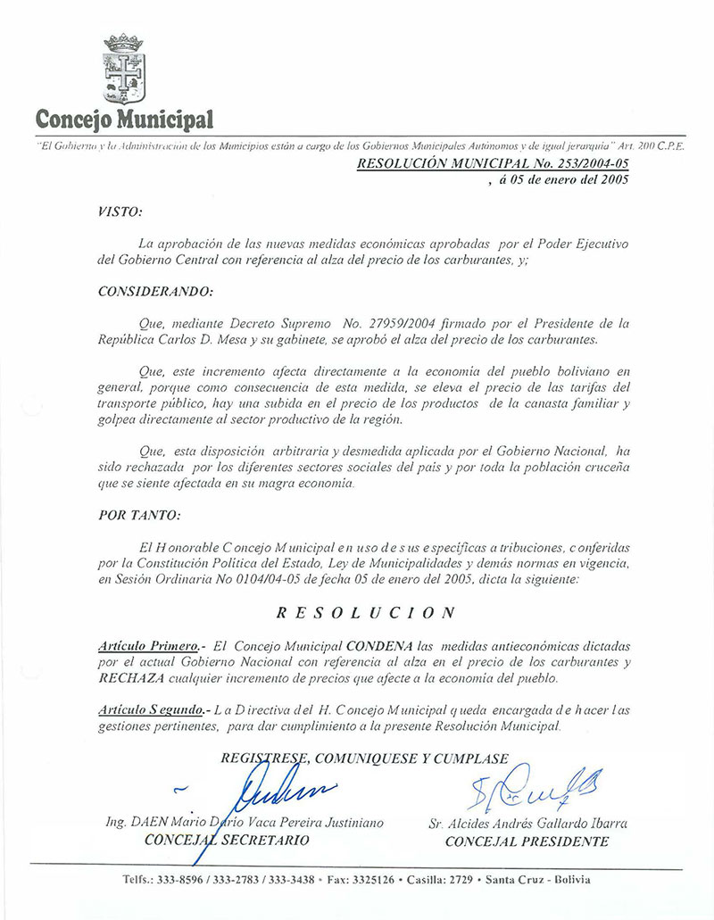 El Concejo Municipal CONDENA las medidas antieconómicas dictadas por el actual Gobierno Nacional, con referencia al alza en el precio de los carburantes y RECHAZA cualquier incremento de precios que afecte a la economía del pueblo.