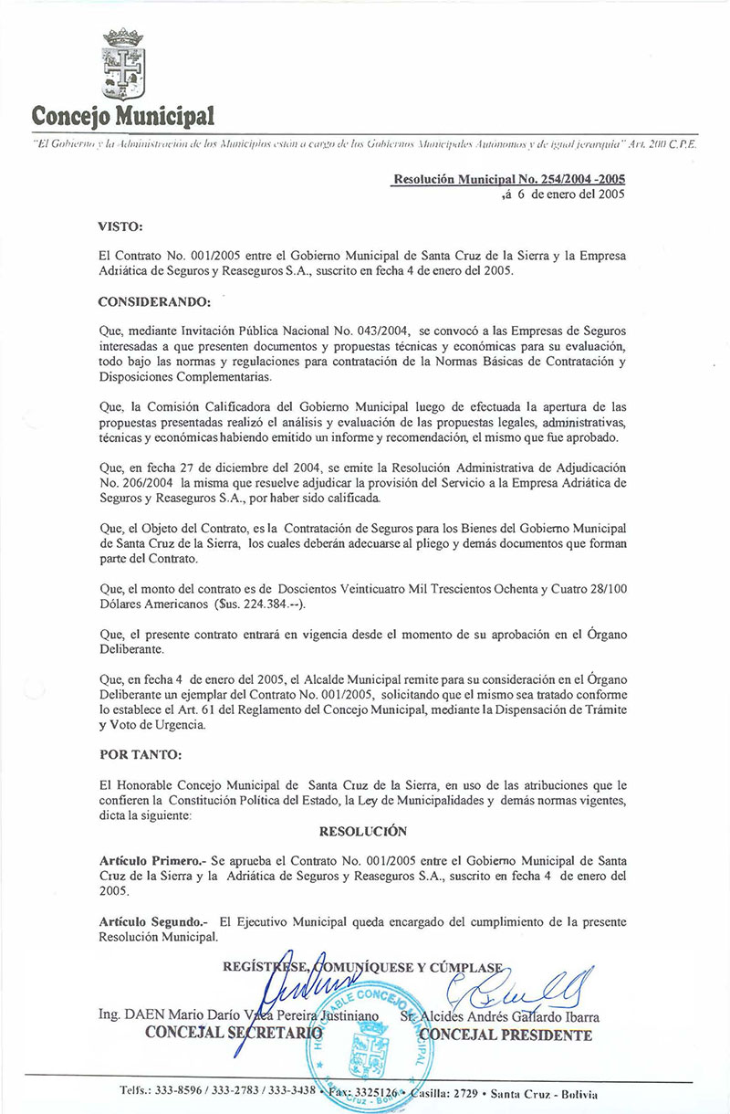 Aprueba el Contrato N° 001/2005, suscrito entre el Gobierno Municipal y la Empresa Adriatica de Seguros y Reaseguros S.A.