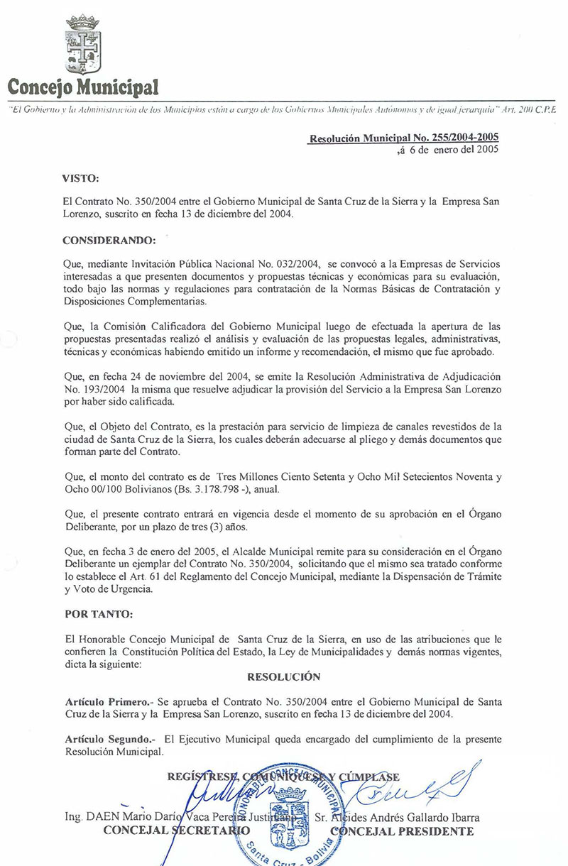 Aprueba el Contrato N° 350/2004, suscrito entre el Gobierno Municipal y la Empresa San Lorenzo, para la prestación del servicio de limpieza de canales revestidos.