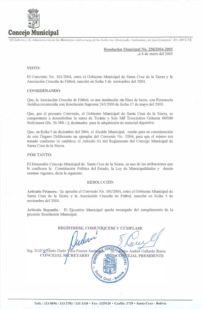 Aprueba el Convenio N° 101/2004, suscrito entre el Gobierno Municipal y la Asociación Cruceña de Fútbol, en la cual se destinan recursos económicos para la adquisición de material deportivo.