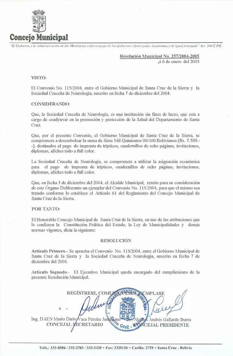 Aprueba el Convenio N°115/2004, suscrito entre el Gobierno Municipal y la Sociedad Cruceña de Neurología, en la cual se destinan recursos económicos para el pago de imprenta.