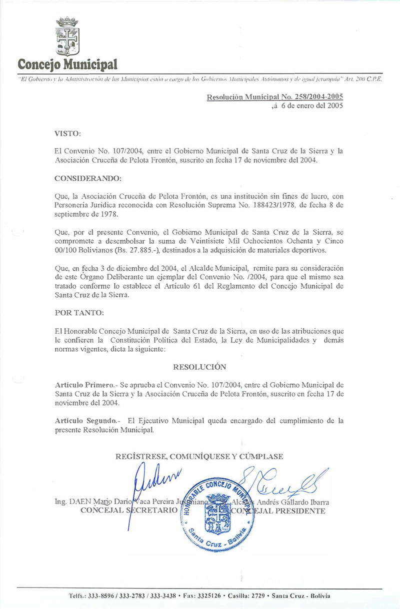 Aprueba el Convenio N° 107/2004, suscrito entre el Gobierno Municipal y la Asociación Cruceña de Pelota de Frontón, en la cual se destinan recursos económicos para la adquisición de material deportivo.