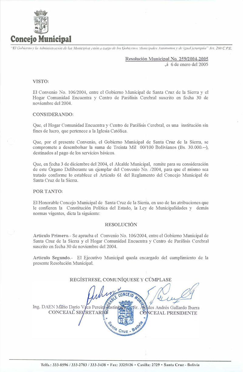 Aprueba el Convenio N° 106/2004, suscrito entre el Gobierno Municipal y el Hogar Comunidad Encuentro y Centro de Parálisis Cerebral.
