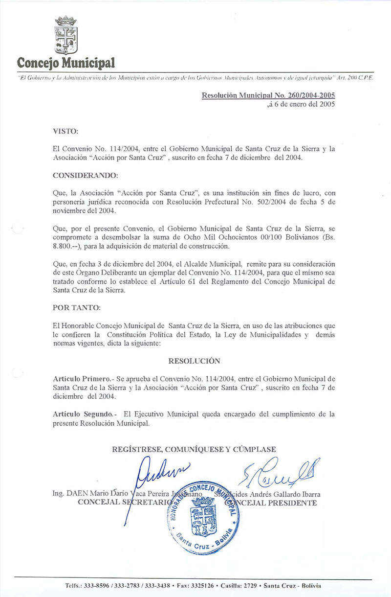 Aprueba el Convenio N° 114/2004, suscrito entre el Gobierno Municipal y la Asociación Acción por Santa Cruz.