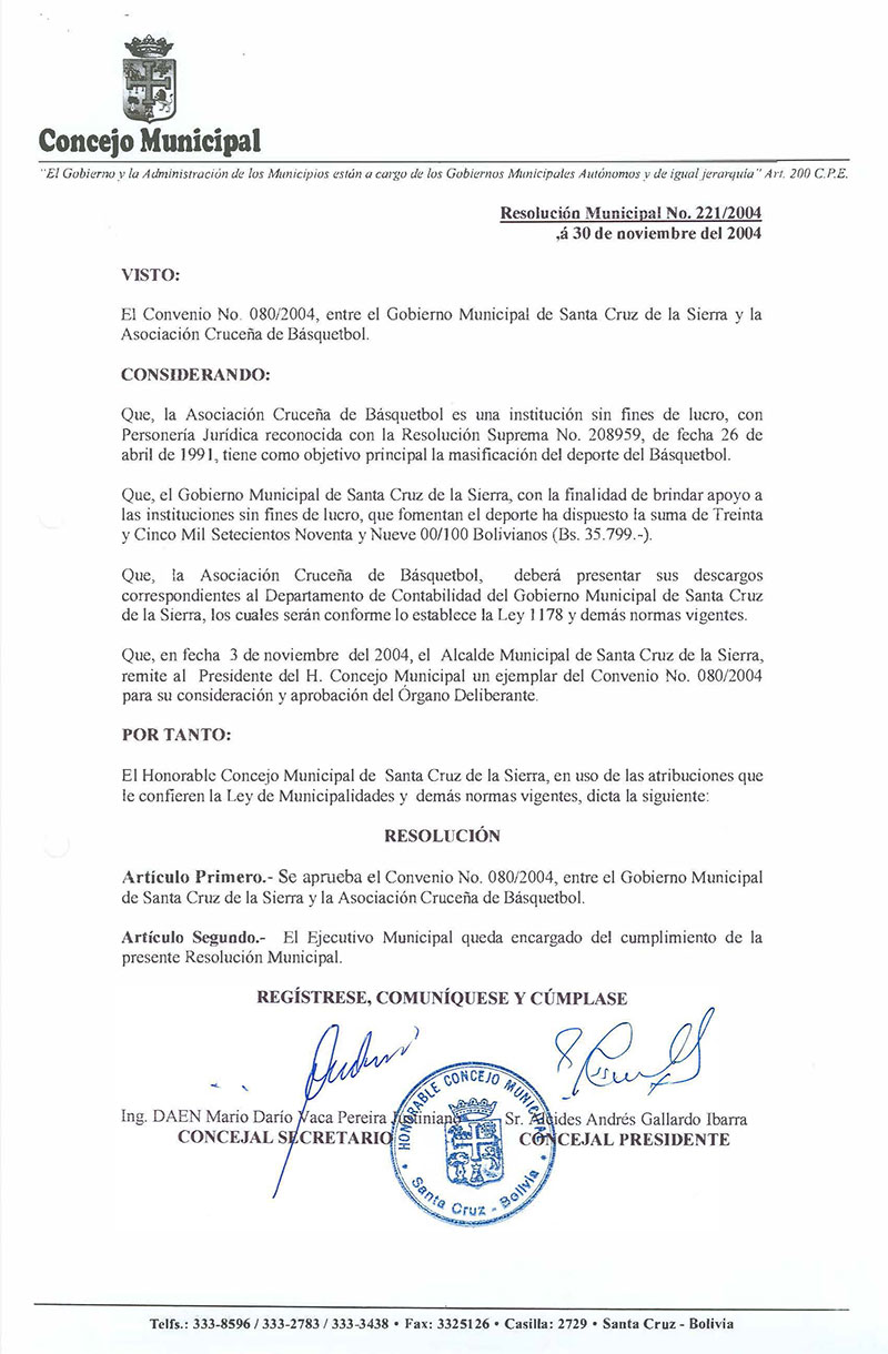 Aprueba el convenio N° 080/2004 entre el Gobierno Municipal de Santa Cruz de la Sierra y la Asociación Cruceña de Basquetball.