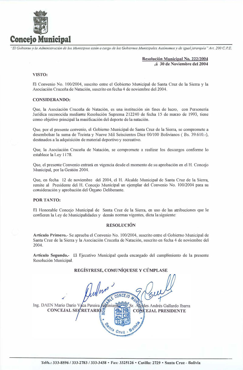 Aprueba el convenio N° 100/2004 suscrito entre el Gobierno Municipal de Santa Cruz de la Sierra y la Asociación Cruceña de Natación , suscrito en fecha 04 de noviembre del 2004.