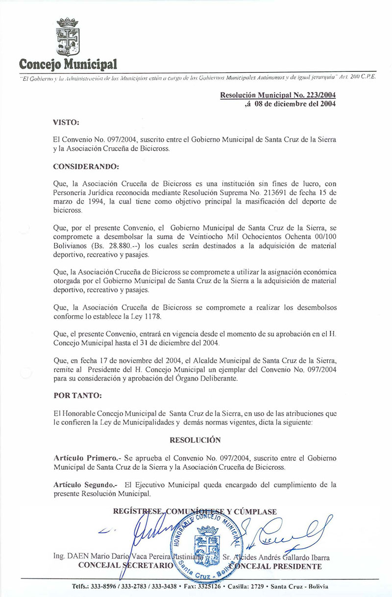 Aprueba el Convenio N° 097/2004, suscrito entre el Gobierno Municipal de Santa Cruz de la Sierra y la Asociación Cruceña de Bicicross.