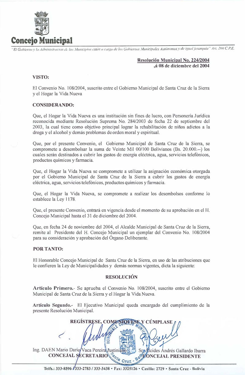 Aprueba el Convenio N° 108/2004, suscrito entre el Gobierno Municipal de Santa Cruz de la Sierra y el Hogar Vida Nueva.