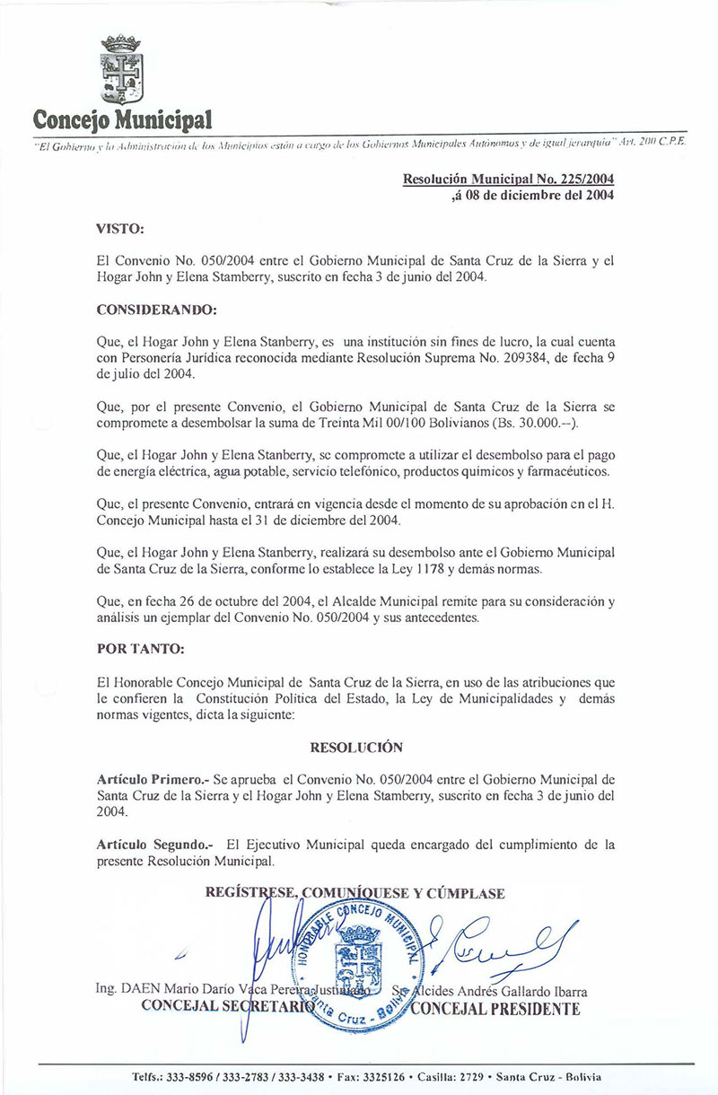 Aprueba el Convenio N° 050/2004 entre el Gobierno Municipal de Santa Cruz de la Sierra y el Hogar John y Elena Stamberry, suscrito en fecha 03 de junio del 2004.
