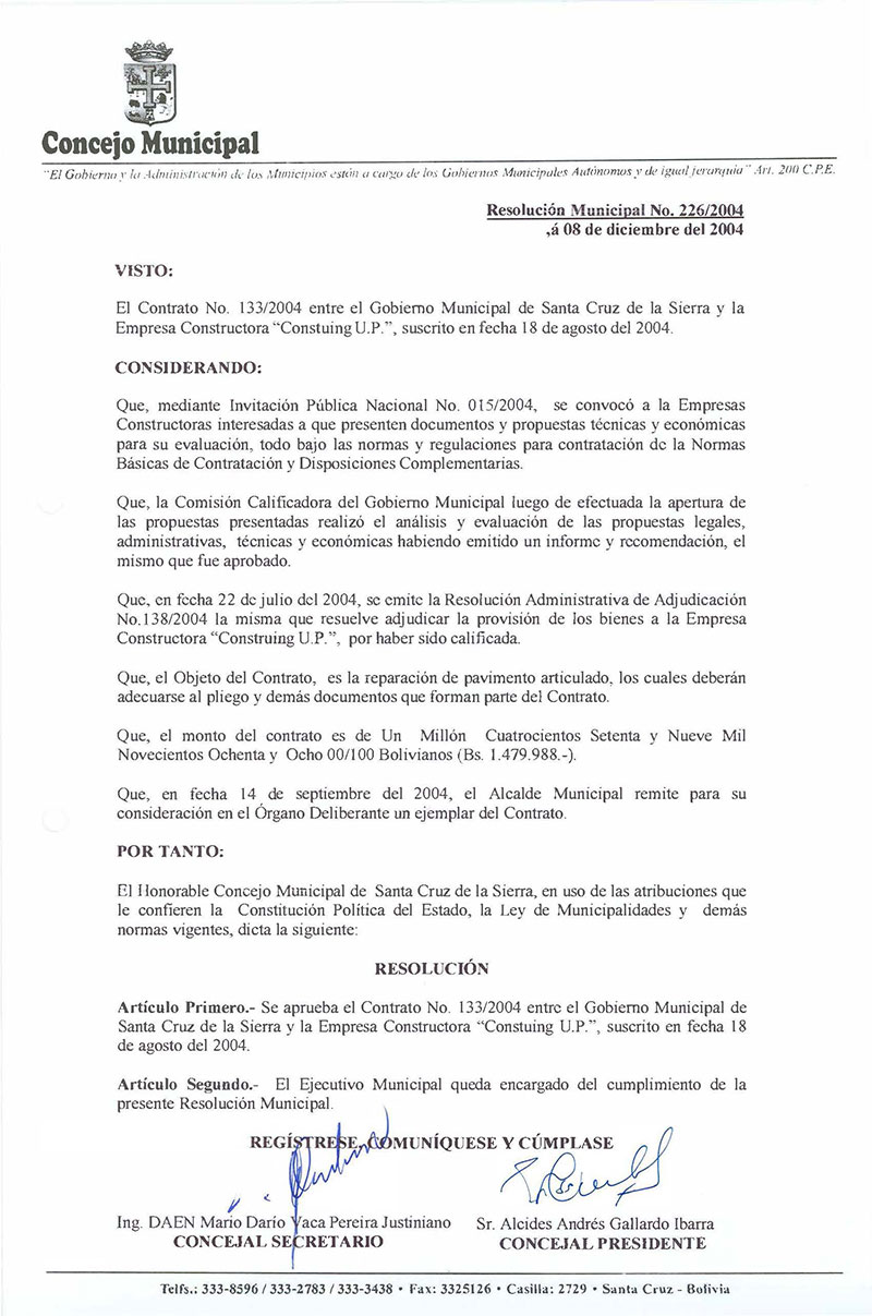 Se aprueba el Contrato N°133/2004 entre el Gobierno Municipal de Santa Cruz de la Sierra y la Empresa Constructora "Constuing U.P.", suscrito en fecha 18 de agosto del 2004.