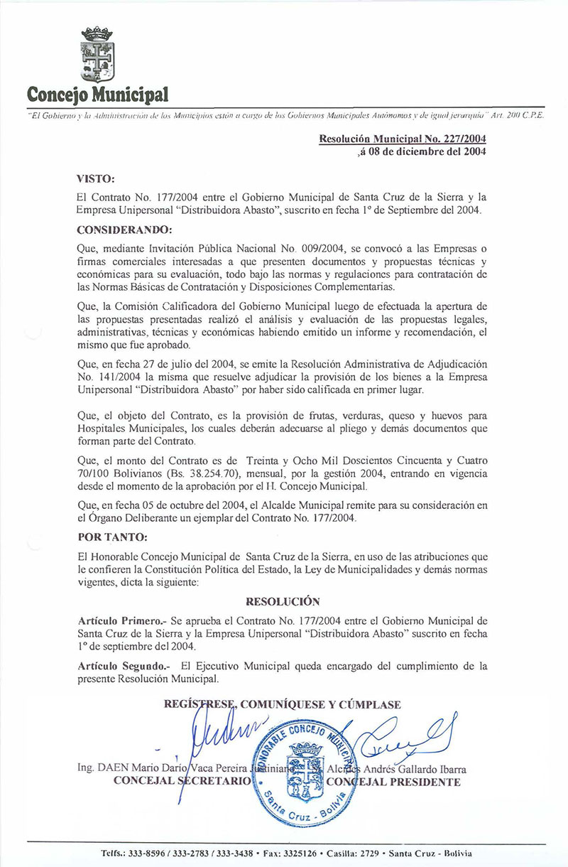 Se aprueba el Contrato No. 177/2004 entre el Gobierno Municipal de Santa Cruz de la Sierra y la Empresa Unipersonal "Distribuidora Abasto" suscrito en fecha 1º de septiembre del 2004.