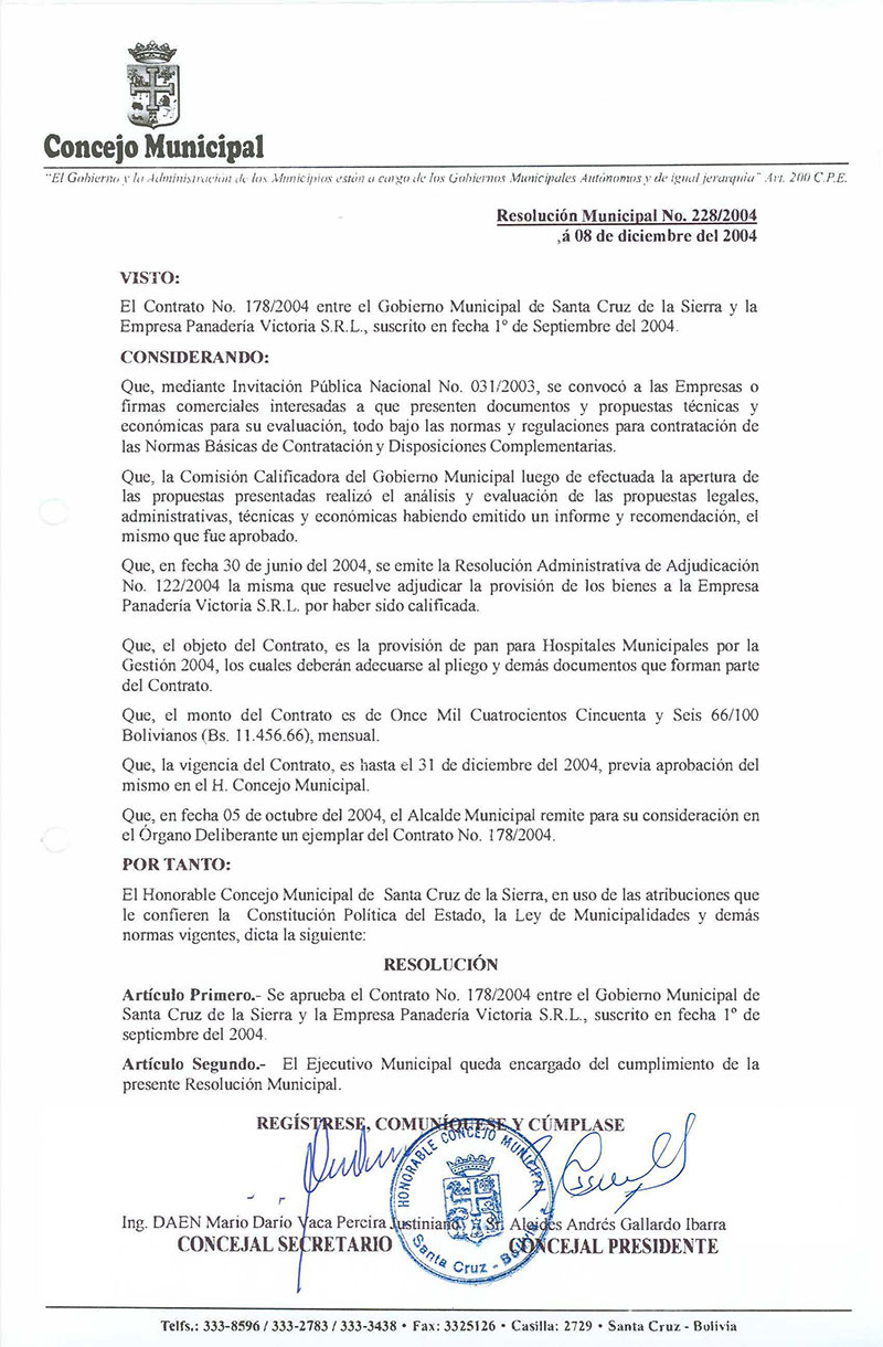 Aprueba el Contrato N° 178/2004 entre el Gobierno Municipal de Santa Cruz de la Sierra y la Empresa Panadería Victoria S.R.L.., suscrito en fecha 1º de septiembre del 2004.