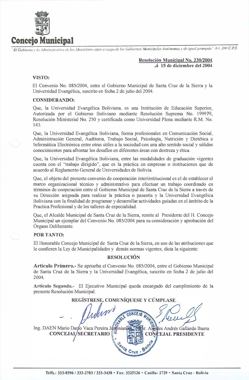 Aprueba el Convenio N° 085/2004, entre el Gobierno Municipal de Santa Cruz de la Sierra y la Universidad Evangélica, suscrito en fecha 2 de julio del 2004.