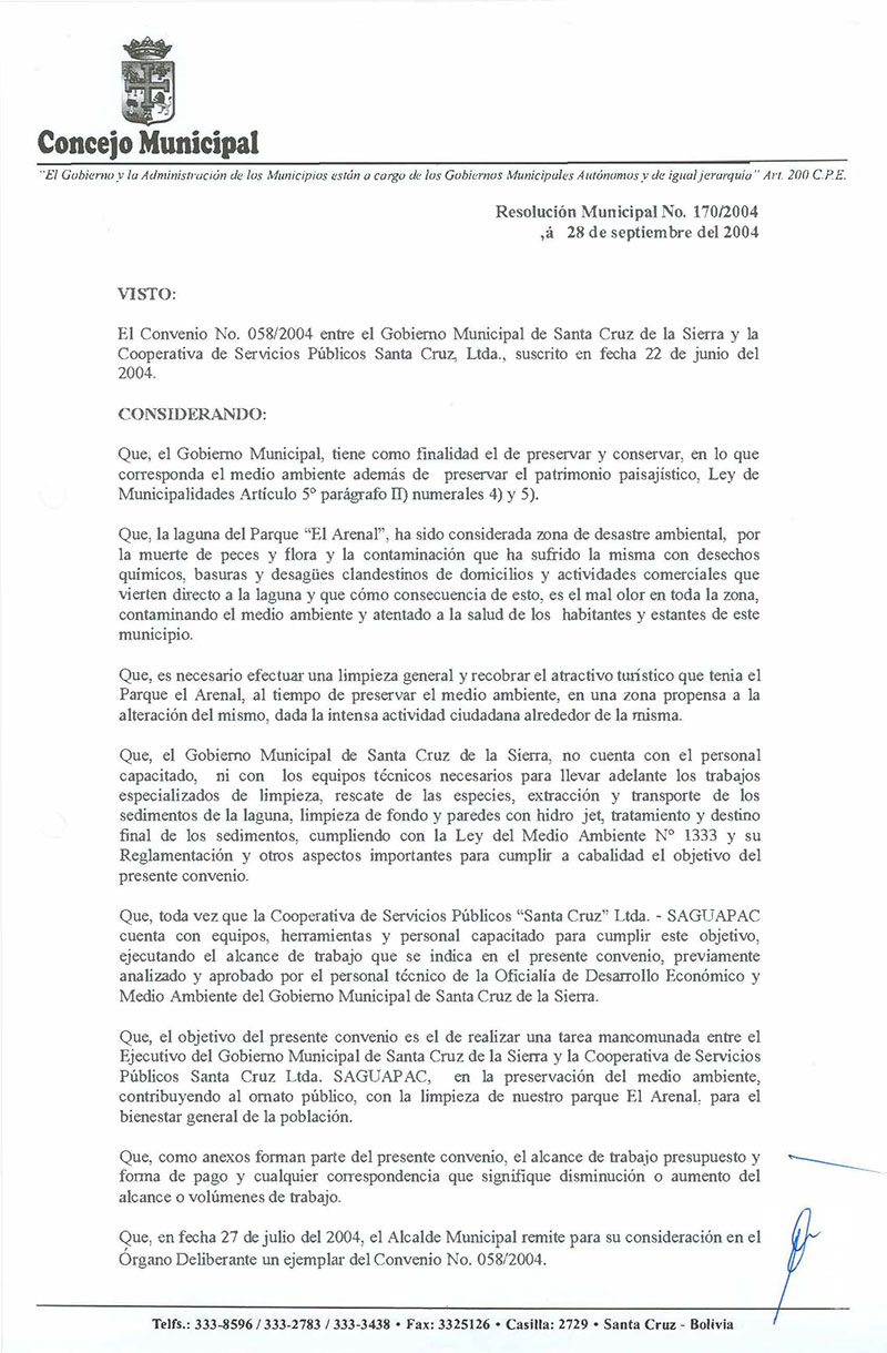 Se aprueba el Convenio No. 058/2004 entre el Gobierno Municipal de Santa Cruz de la Sierra y la Cooperativa de Servicios Públicos Santa Cruz, Ltda., suscrito en fecha 22 de junio del 2004.